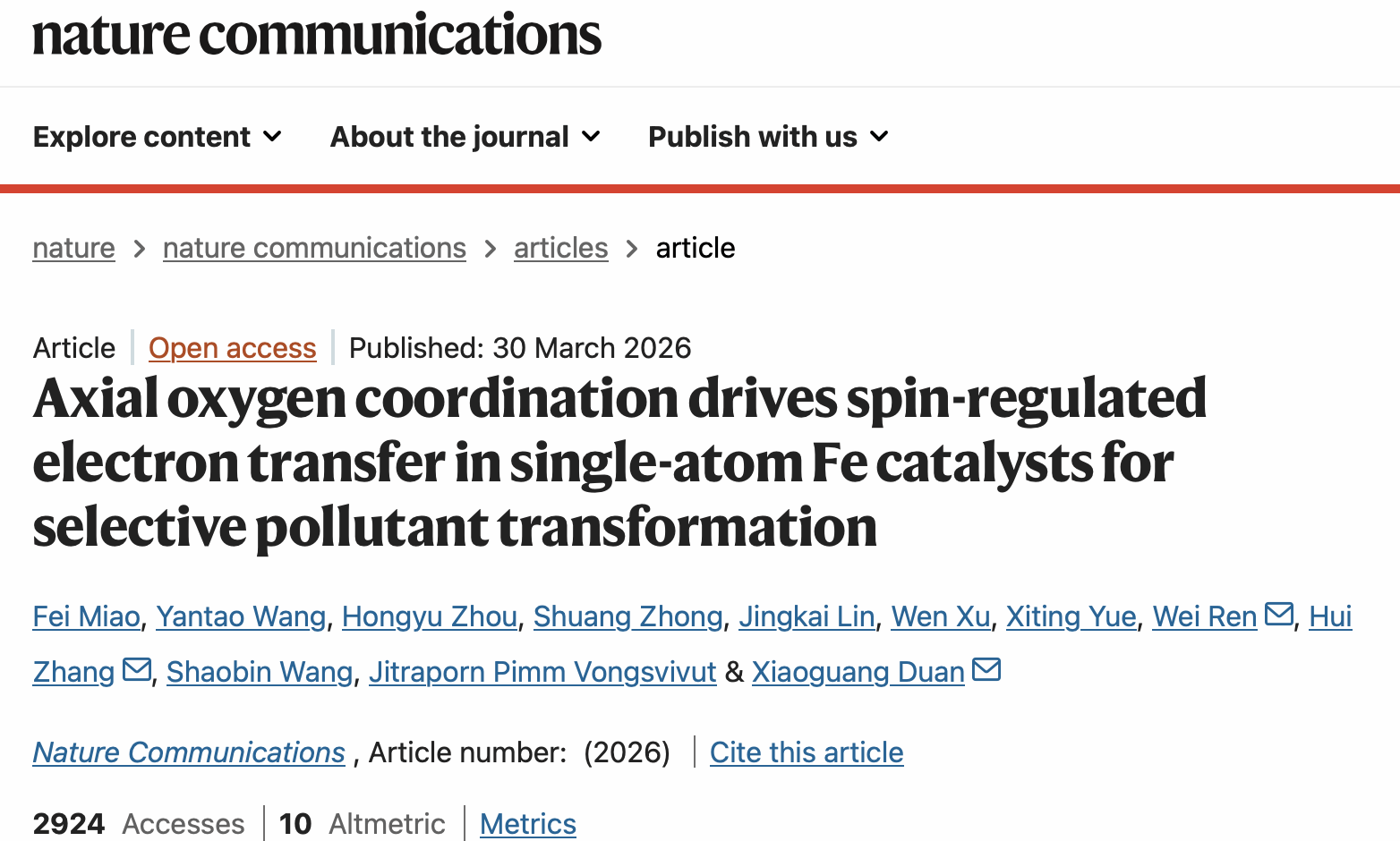 近日,英国365集团苗菲博士在单原子催化剂调控及复杂废水低碳治理方面取得突破性研究进展。相关研究以“Axial oxygen coordination drives spin-regulated electron transfer in single-atom Fe catalysts for selective pollutant transformation”为题,发表于国际顶级综合类期刊《Nature Communications》(一区TOP期刊,最新影响因子15.7)。英国365上市公司为第一完成单位,苗菲为论文第一作者,阿德莱德大学Xiaoguang Duan教授、武汉大学张晖教授及南昌航空大学任伟副教授为共同通讯作者。